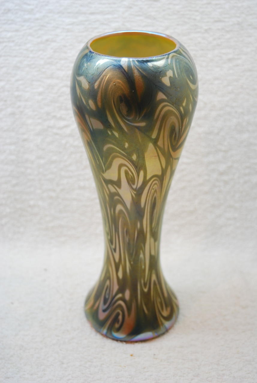 Loading... Please wait...This is for a really beautiful large Durand Art Nouveau King Tut Vase produced during the 1920's. It is in amazing shape with no chips, cracks, or repairs. It has a really great pattern and color as shown. Measures 10" tall. A really beautiful piece of American Art Nouveau Glass.