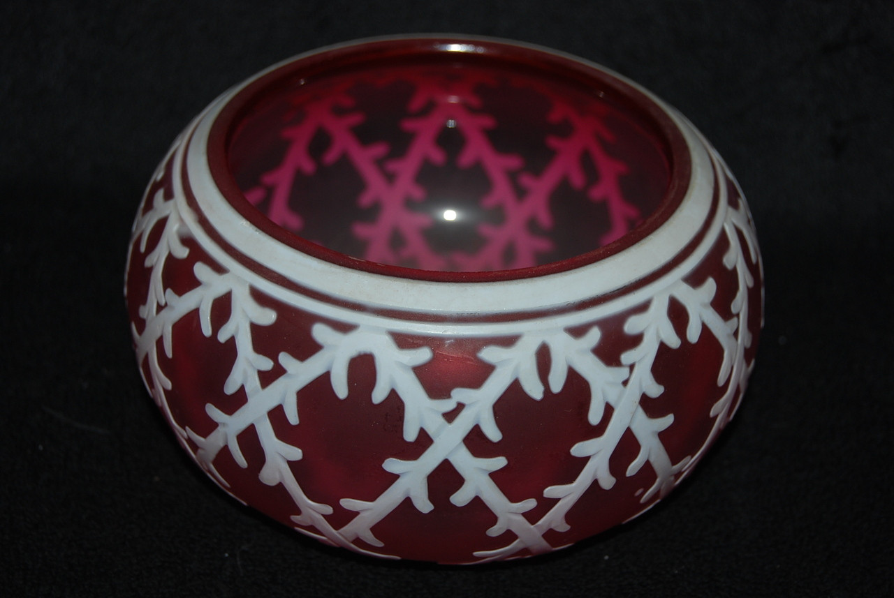 Loading... Please wait...This is for a really beautiful Victorian British Cranberry Cameo Bowl produced during the 1880's. Not signed and cannot be sure of maker. The color and pattern are amazing as shown. Looks like some sort of lattice pattern. It is in amazing shape with no chips, cracks, or repairs. Really Heavy for its size. Measures 5 3/4" across at its widest and 3 1/4" tall. A really beautiful piece of Victorian Art Glass. INV #14-0129.