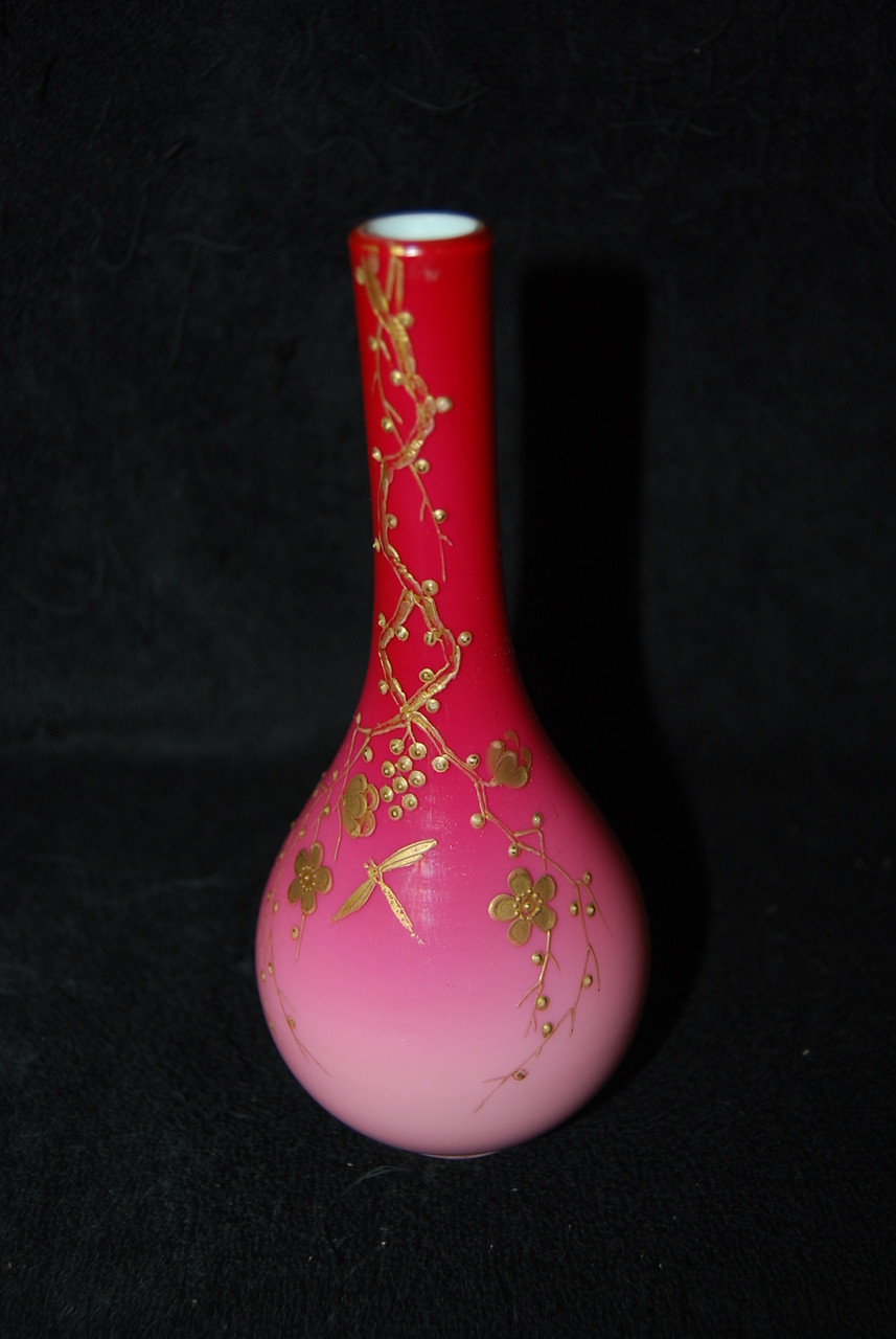 Loading... Please wait...This is for a really beautiful Victorian Webb Decorated Cased Peachblow Vase produced during the 1880's. It is in amazing shape with no chips, cracks, or repairs. The color is really great on this one as shown. Great top with a white glossy finish on the inside. Polished pontil showing the inner layer of glass which is typical of Webb. Measures 7 1/4" tall. A really beautiful piece of Victorian Art Glass. INV #838.