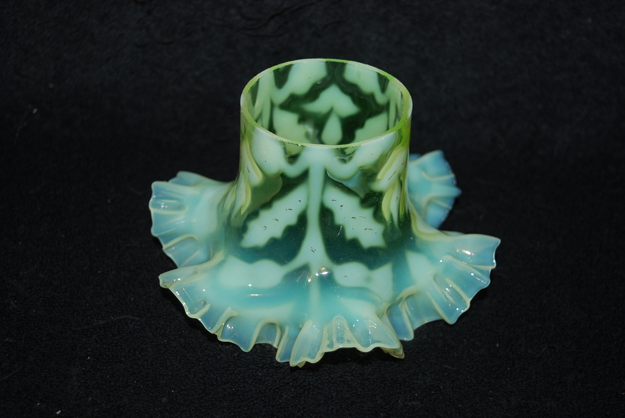 Loading... Please wait...This is for a really beautiful Victorian Vaseline Opalescent Thistle Pattern Art Nouveau Lamp Shade produced during the 1890s in England or Bohemia. It is in amazing shape with no chips, cracks, or repairs. I have 2 of these available, the price is just for one of them. There are very tiny specks of ash in the shade as shown. Extremely tiny flea bites on the fitter rim. This shade glows wonderfully under black light. Great color and amazing thistle pattern as shown. Measures 3 1/2" tall with a 2 5/8" fitter rim. A really beautiful Victorian Art Nouveau shade.