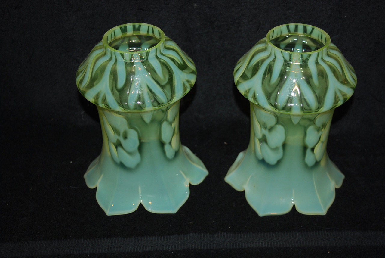 Loading... Please wait...This is for a really beautiful matching pair of Victorian Vaseline Opalescent Art Nouveau Flower Lamp Shades produced during the 1890's. They are in amazing shape with no chips, cracks, or repairs. They have really great opalescence and color as shown. They glow wonderfully under black light. Each measures 7 1/2" tall with a 2 5/8" inch top rim. A really beautiful pair of Victorian Art Glass Shades.