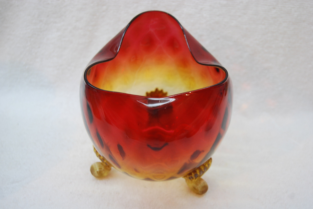 Loading... Please wait...This is for a really beautiful and rare Victorian Mt Washington or New England Glass Company Diamond Quilted Amberina Tri-footed Vase produced during the 1880's. It is in amazing shape with no chips, cracks, or repairs. The coloring is really amazing with a polished pontil on the bottom. Measures 5 1/2" tall. A really beautiful Victorian Art Glass Vase. INV #14-0701.