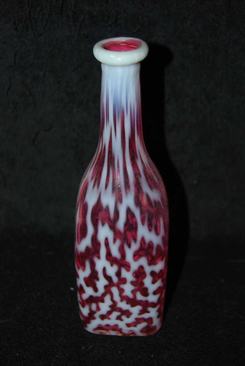 Loading... Please wait...This is for a beautiful Victorian Cranberry Opalescent Coral Reef Square Barbers Bottle. Made by J. H. Hobbs, Brockunier & Company in the 1890s, it is in excellent condition with no chips, cracks, or repairs. Great ruby/cranberry opalescent coloring and square form as shown. The lip of the bottle has a white glossy finish showing the inner layer of polished glass. Measures 8 1/4" tall. A truly exquisite piece of Victorian Art Glass. INV #14-1349.