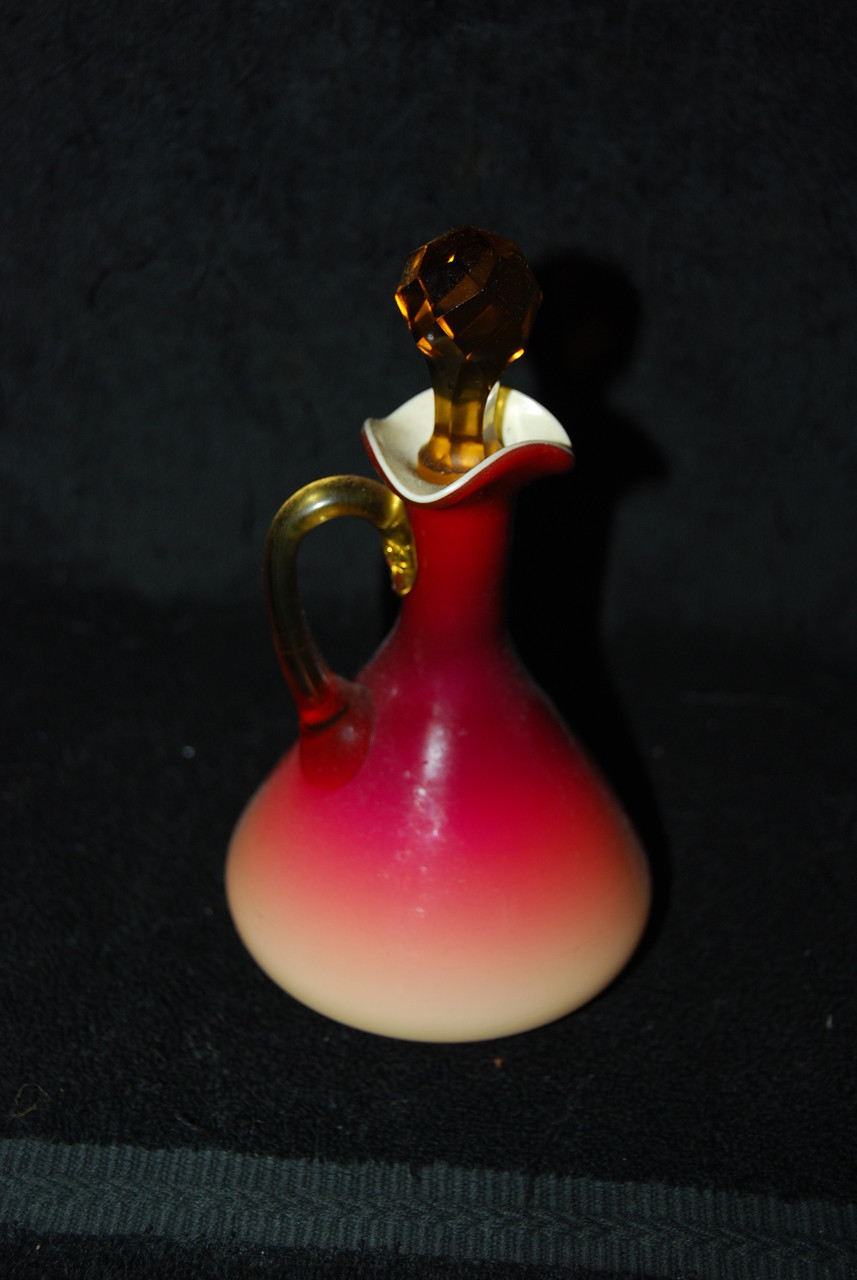 Loading... Please wait...This is a really elegant Glossy Peachblow Funnel Cruet. Produced by Hobbs, Brockunier & Company in the 1880s, it is in great shape free of chips, cracks or repairs. A Wheeling Peachblow bulbous cruet, it has an amber faceted stopper, amber reeded handle with no heat check and is lined with white glass. This is the glossy finish that was originally called Coral. Finely polished pontil mark. Measures 6 3/4" tall. A beautiful Victorian piece of American Art Glass. INV #00-0123.