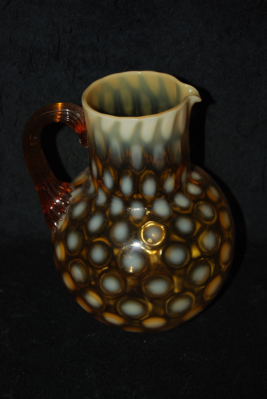 Loading... Please wait...This is for an incredible Victorian Amber Opalescent Coinspot Pitcher produced by the Phoenix Glass Company in the 1880s. It is in great condition as it is undamaged with no chips, cracks or repairs. The pitcher is a beautiful example of Phoenix's classic optic coin dot patern of amber opalescent with a circular rim and applied amber reeded handle. Polished pontil mark. Measures 8 1/4" tall. An exquisite piece of early American art glass. INV #15-0114.
