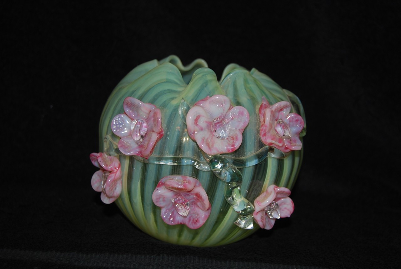 Loading... Please wait...This is a really beautiful Victorian Vaseline Opalescent Rose Bowl with Applied Pink Flowers produced during the 1880's to 1890's either in Bohemia or England. It is in really great shape with no chips, cracks, or repairs. Glows wonderfully under black light as shown. Measures about 5 1/2" across and 5" tall. A really beautiful piece of Victorian Art Glass. INV #0012