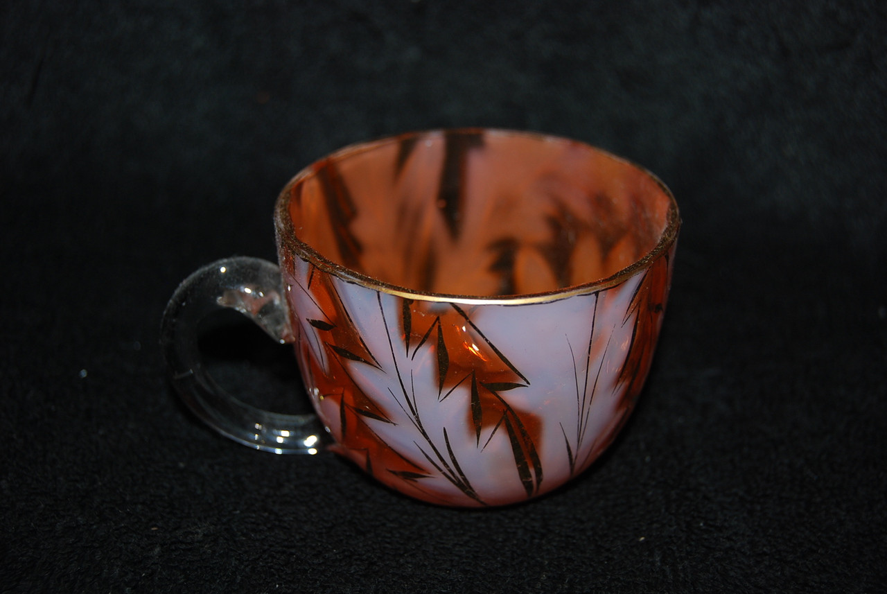 Loading... Please wait...This is for an especially gorgeous and uncommon Victorian West Virginia Apricot Opalescent Scottish Moor Punch Cup produced during the 1890s. It is in remarkable condition with no chips, cracks, or repairs. Cup is bittersweet opalescent with gilt decoration outlining pattern, applied colorless handle and factory polished rim. Measures 2 1/4" tall. A really terrific piece of Victorian Art Glass. INV #15-0150